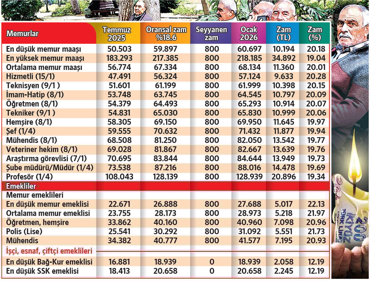 Aralık 2025’te en düşük emekli aylığı 16.881 TL idi. Temmuz-aralık döneminde yüzde 12.19’luk enflasyon sebebiyle bu miktarın üzerine zam yapılacak.