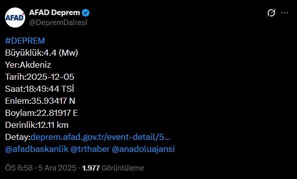 Son dakika deprem haberi: AFAD’dan yapılan açıklamaya göre, Akdeniz açıklarında 4.4 büyüklüğünde bir deprem meydana geldi.